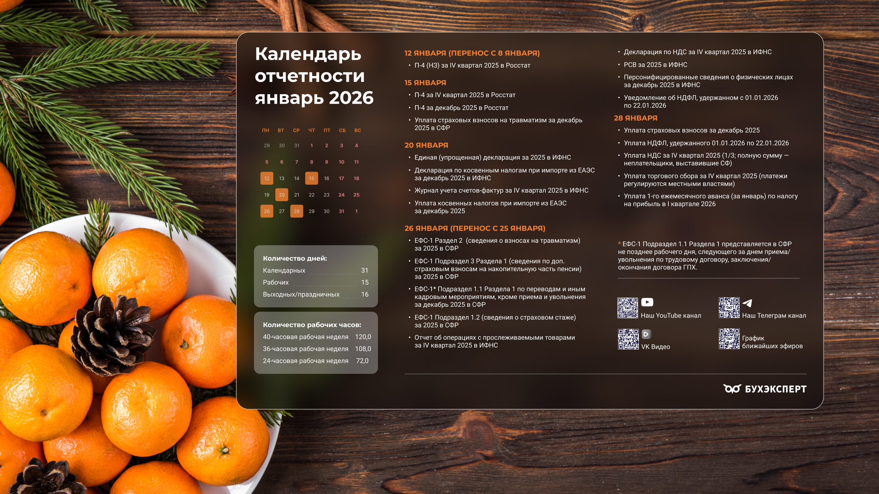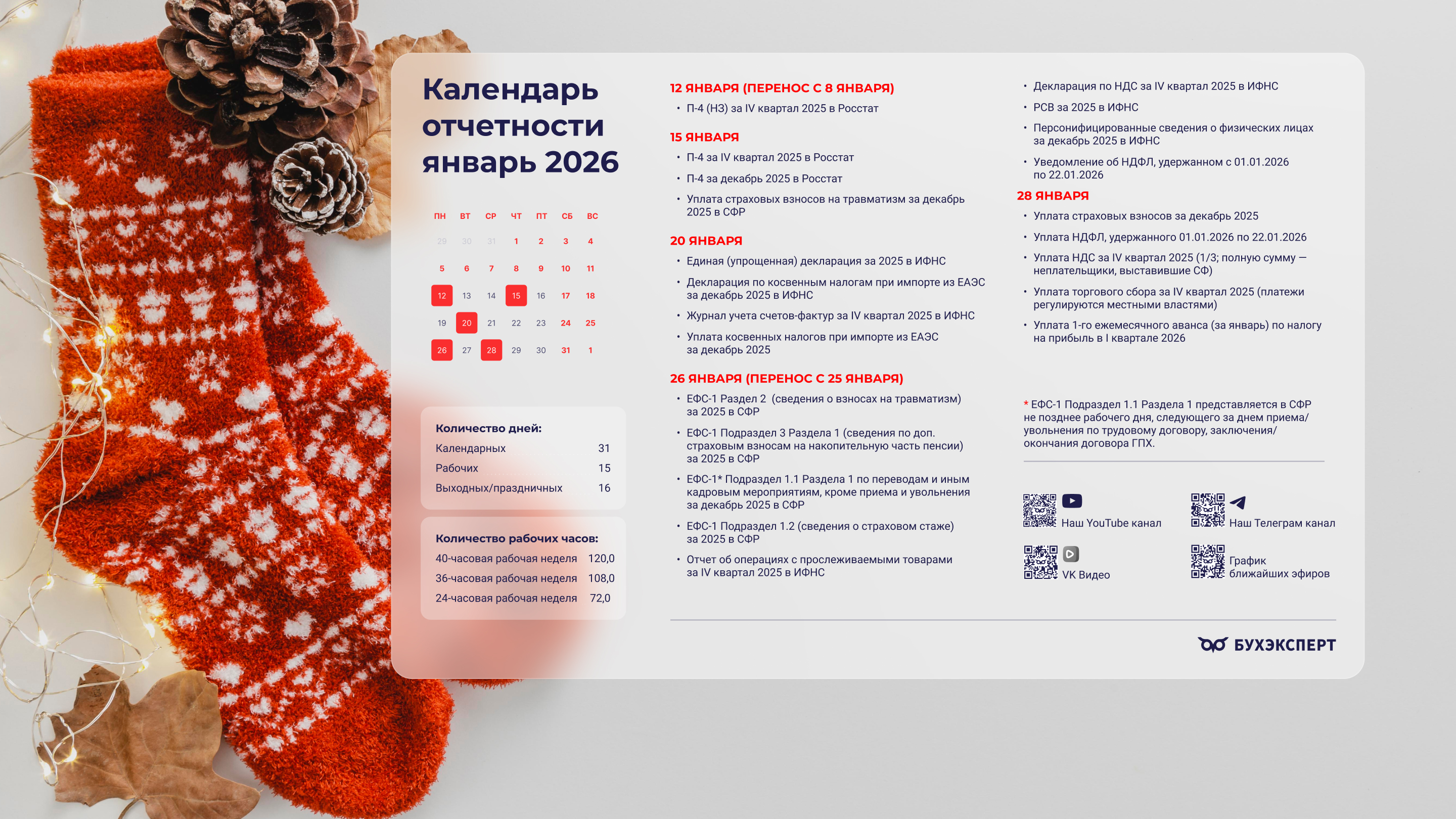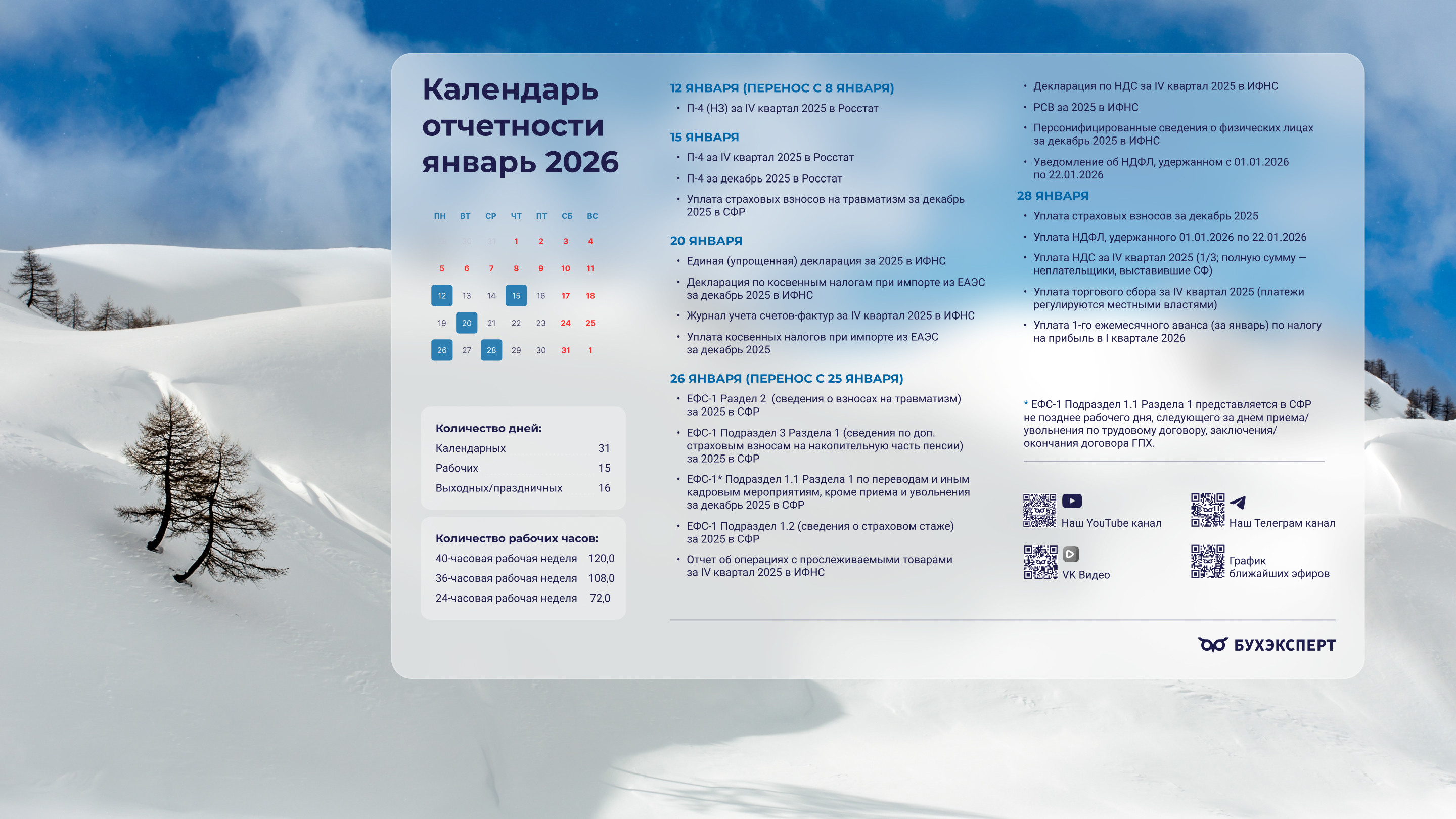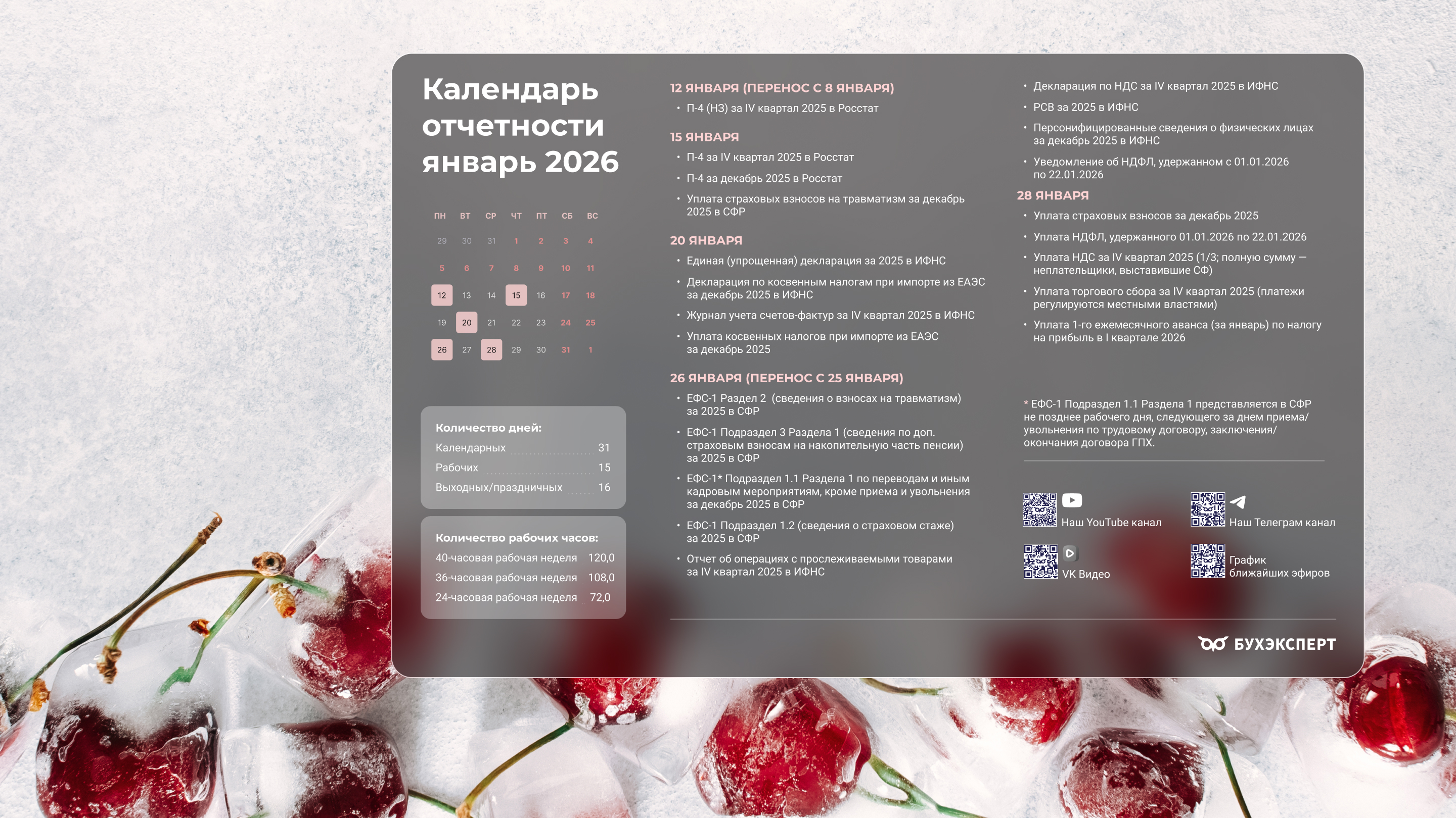 от команды Бухэксперт специально для бухгалтеровПоставив обои на рабочий стол, вы сможете всегда иметь перед глазами календарь с датами сдачи отчетности и перечисления платежей в бюджет. Кроме того, на обоях указаны выходные и праздничные дни, а также количество рабочих дней и часов, чтобы вам удобнее было заполнять табель и рассчитывать зарплату сотрудникам.