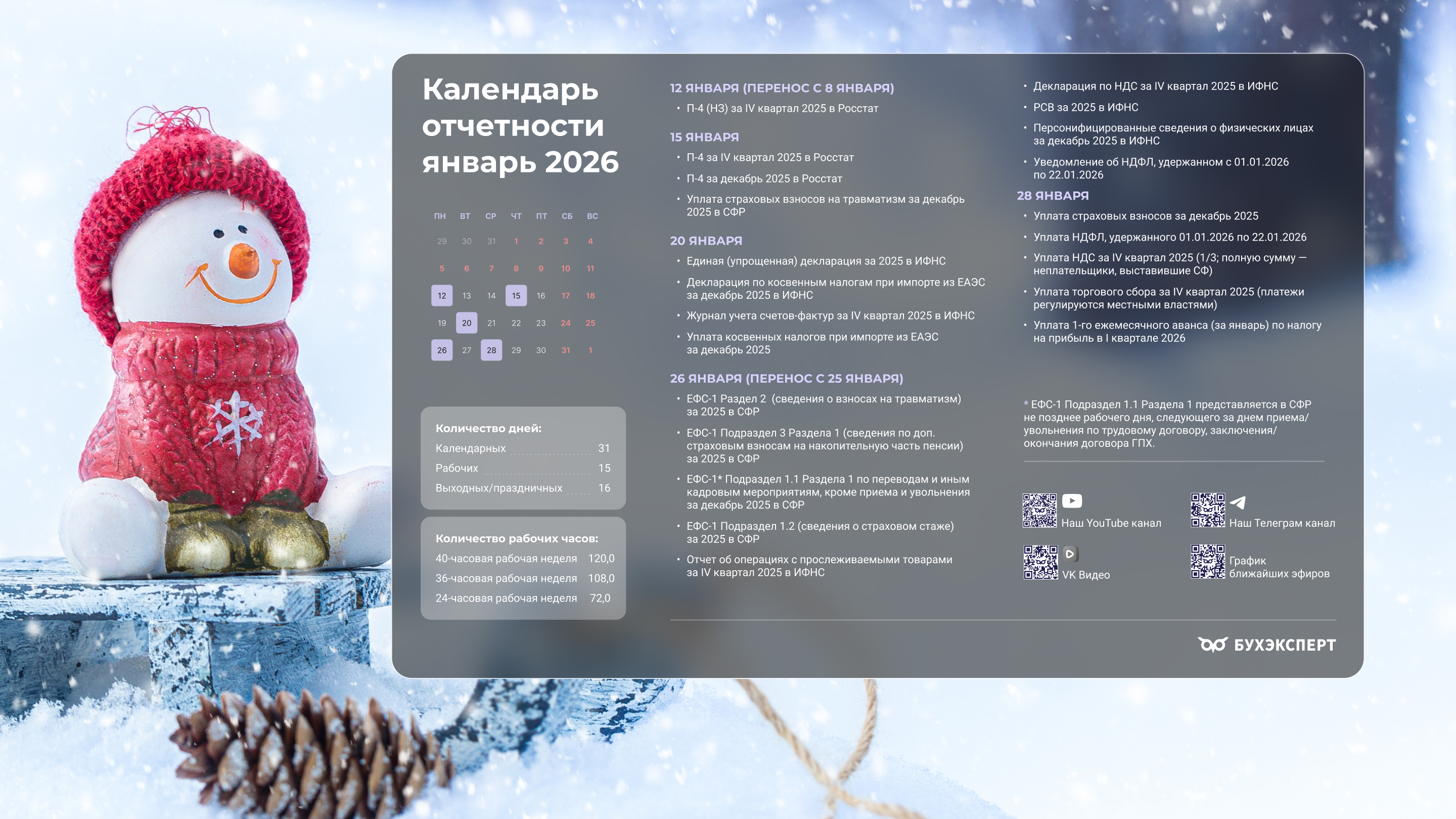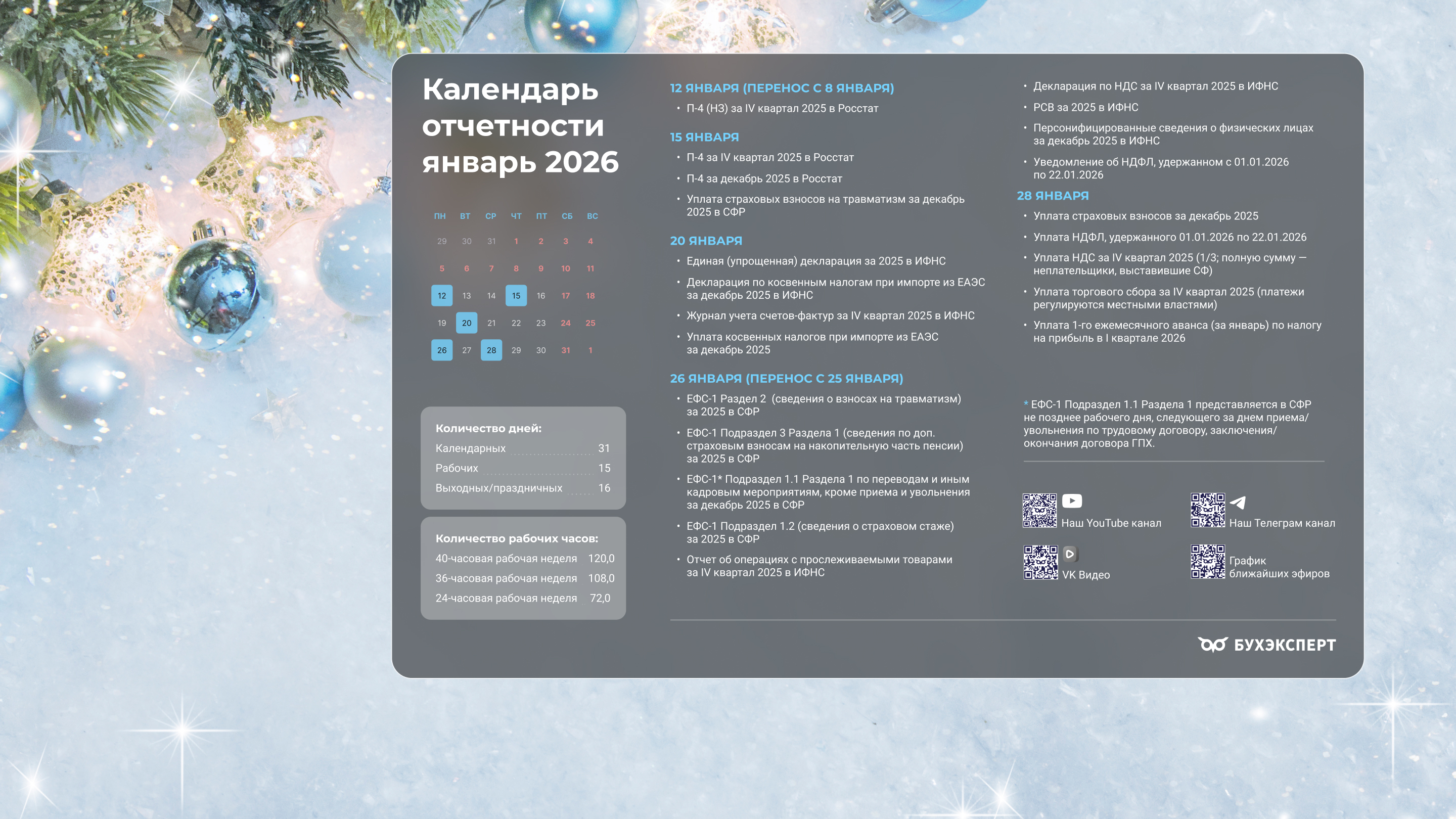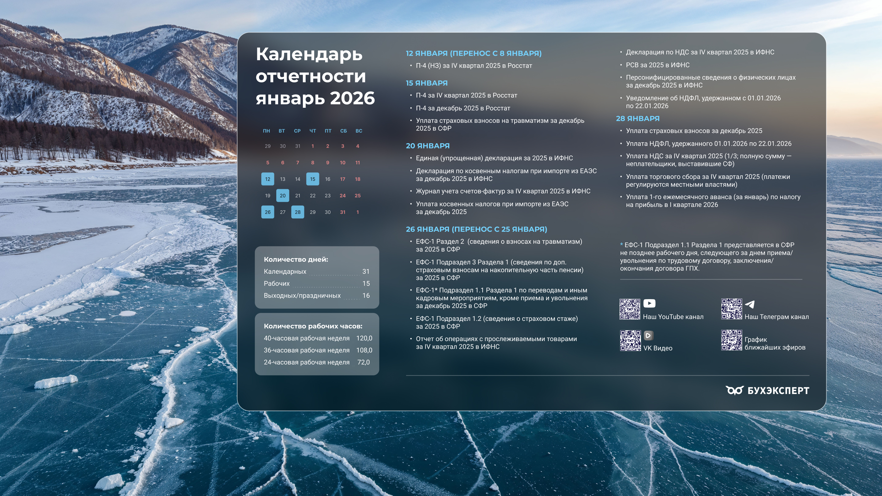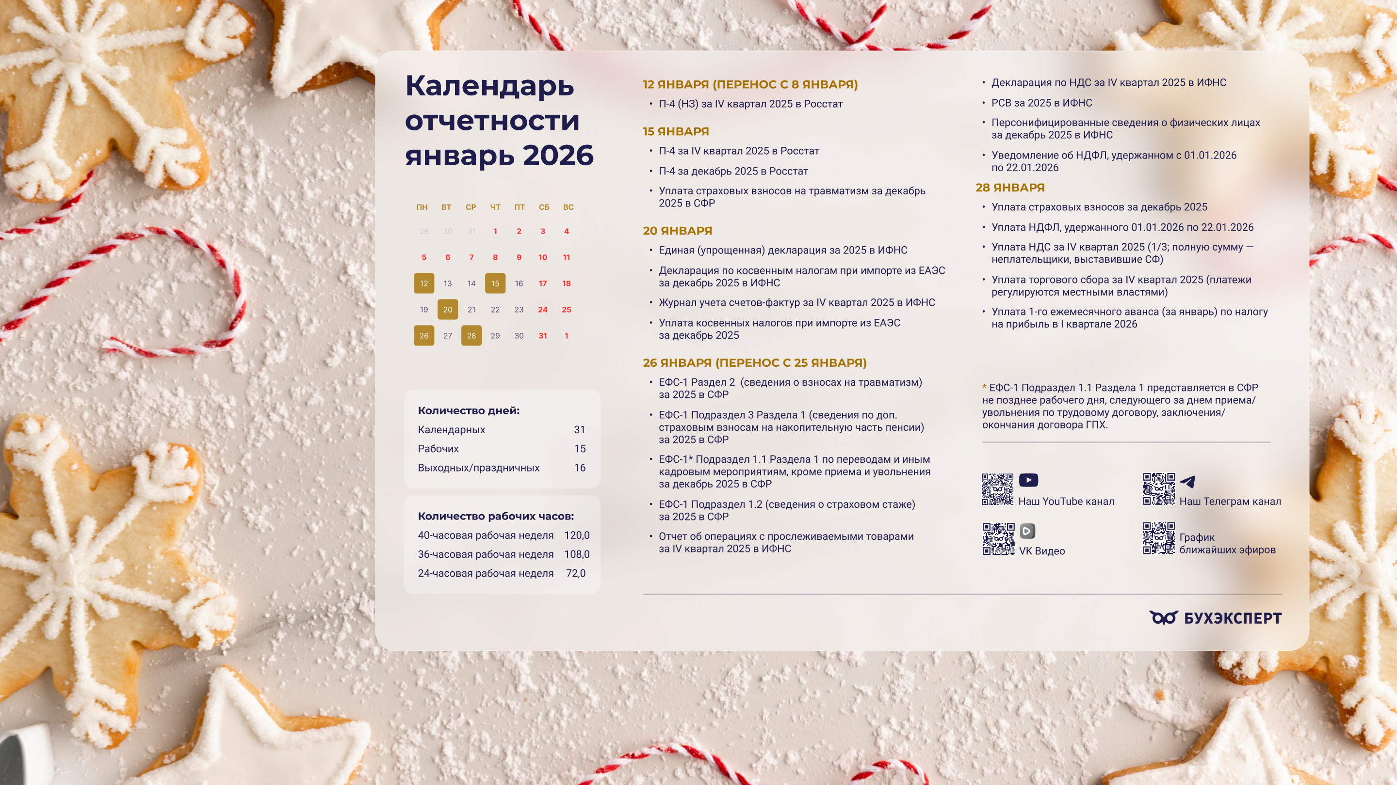 от команды Бухэксперт специально для бухгалтеровПоставив обои на рабочий стол, вы сможете всегда иметь перед глазами календарь с датами сдачи отчетности и перечисления платежей в бюджет. Кроме того, на обоях указаны выходные и праздничные дни, а также количество рабочих дней и часов, чтобы вам удобнее было заполнять табель и рассчитывать зарплату сотрудникам.